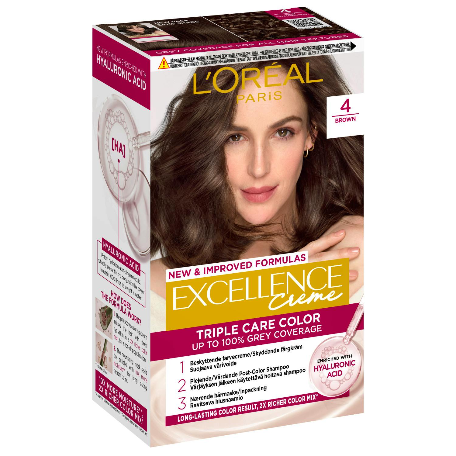 L'Oréal Paris Excellence Crème är en fantastisk permanent hårfärg för dig som vill täcka gråa hårstrån och samtidigt skydda och stärka ditt hår. Excellence Crème erbjuder klassiska och eleganta hårfärger med ett fylligt färgresultat som sitter i länge. Triple Care Color-rutinen är berikad med hyaluronsyra och verkar i tre steg som stärker och skyddar håret, ger 10X mer fukt** och har en färgblandning som är 2X fastare* så att det inte droppar under färgning. Täcker alla gråa hårstrån upp till 100% och passar alla hårtyper. Viktigt: Färgblandningen kan se mörkare ut vid applicering än tidigare formulor men slutresultatet är samma så länge verkningstiden på 30 minuter följs.