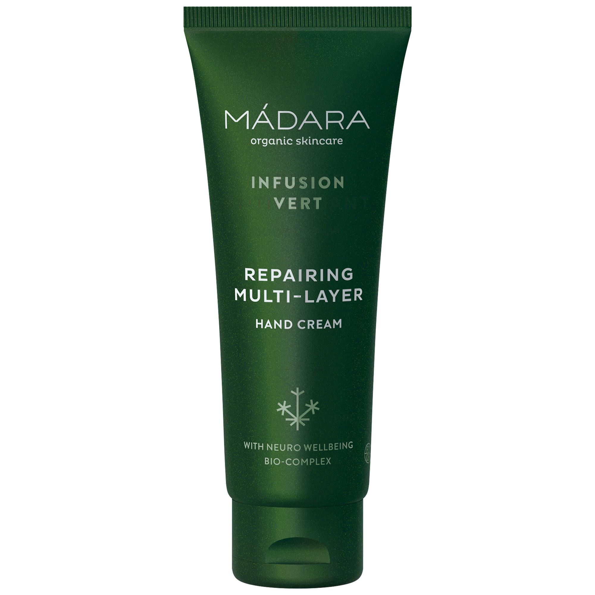 Infusion Vert Repairing Multi-Layer Hand Cream från MÁDARA är en extraordinärt näringsrik handkräm, speciellt utvecklad för att vårda och återfukta torra, grova händer.