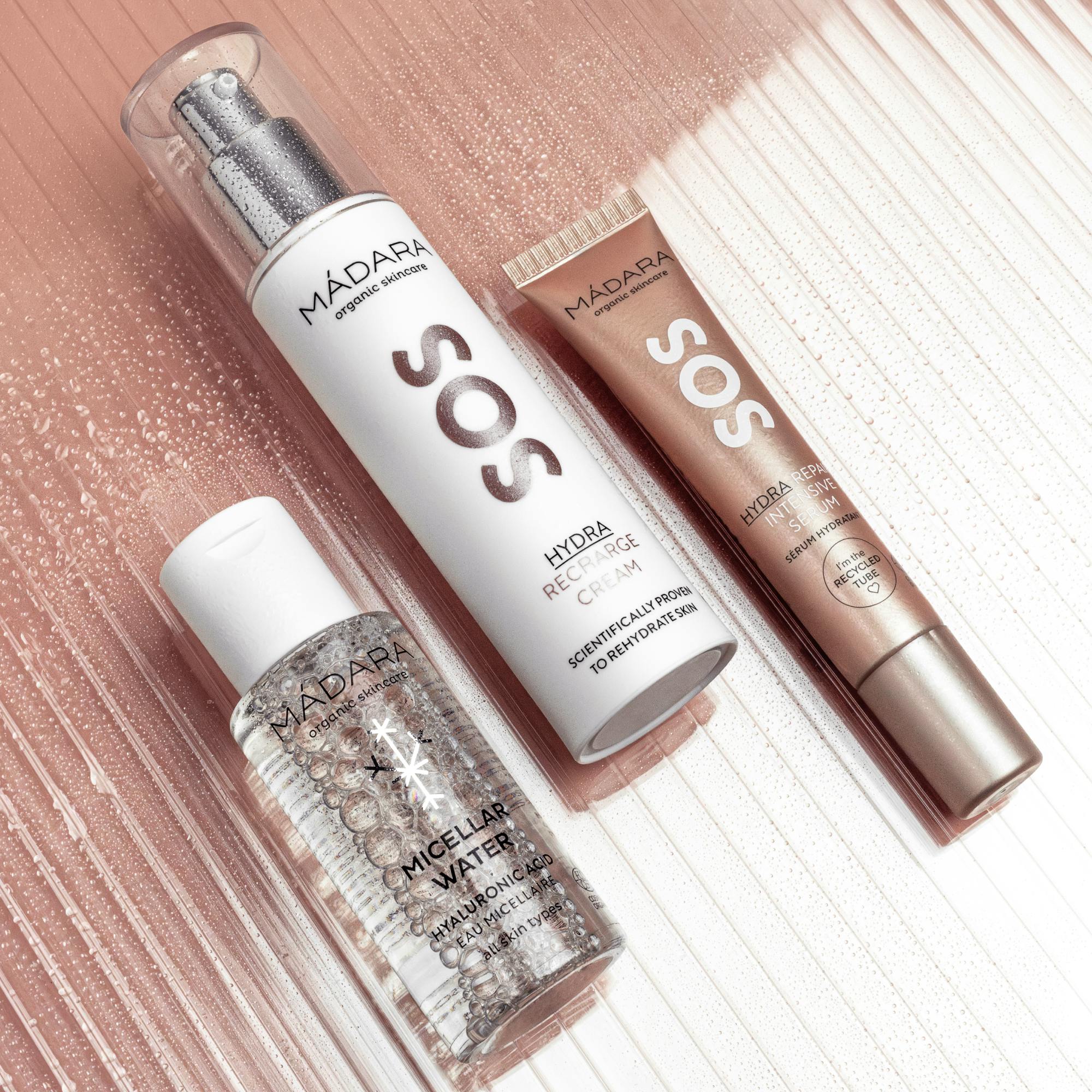 1. SOS HYDRA Recharge cream, 50ml - AQUA; SIMMONDSIA CHINENSIS (JOJOBA) SEED OIL; GLYCERIN; CAPRYLIC/CAPRIC TRIGLYCERIDE; GLYCERYL STEARATE; BEHENYL ALCOHOL; ISOAMYL LAURATE; ROSA DAMASCENA (ROSE) FLOWER WATER; HIPPOPHAE RHAMNOIDES (SEA BUCKTHORN) FRUIT EXTRACT; SODIUM PCA; SODIUM LEVULINATE; AROMA; CETEARYL ALCOHOL; LECITHIN; CELLULOSE; SODIUM ANISATE; PALMITIC ACID; STEARIC ACID; LACTIC ACID; GLYCINE SOJA STEROLS; LINUM USITATISSIMUM (FLAX) SEED EXTRACT; URTICA DIOICA (NETTLE) LEAF EXTRACT; XANTHAN GUM; PAEONIA LACTIFLORA (PEONY) ROOT EXTRACT; SODIUM HYALURONATE; SODIUM PHYTATE; ASCORBYL PALMITATE; HYDROLYZED HYALURONIC ACID; TOCOPHEROL; CI 77491 (IRON OXIDES); BENZYL ALCOHOL; SODIUM BENZOATE; POTASSIUM SORBATE; CITRONELLOL; GERANIOL; BENZYL SALICYLATE; EUGENOL2. Micellar water, 50ml - ALOE BARBADENSIS (ALOE) LEAF JUICE; BUTYLENE GLYCOL; GLYCERIN; CAPRYLYL/CAPRYL GLUCOSIDE; HAMAMELIS VIRGINIANA (WITCH-HAZEL) LEAF WATER; ROSA DAMASCENA (ROSE) FLOWER WATER; AQUA; POLYGLYCERYL-4 CAPRATE; SODIUM LEVULINATE; SODIUM BENZOATE; LACTIC ACID; PAEONIA LACTIFLORA (PEONY) ROOT EXTRACT; SODIUM PCA; AROMA; PROPANEDIOL; XYLITYLGLUCOSIDE; ANHYDROXYLITOL; BENZYL ALCOHOL; XYLITOL; SODIUM HYALURONATE; POTASSIUM SORBATE; PHRAGMITES COMMUNIS EXTRACT; PORIA COCOS EXTRACT; RHAMNOSE; GLUCOSE; GLUCURONIC ACID3. SOS HYDRA Repair Intensive serum, 15ml - ALOE BARBADENSIS (ALOE) LEAF JUICE; HELIANTHUS ANNUUS (SUNFLOWER) SEED OIL; GLYCERIN; GLYCERYL STEARATE CITRATE; PENTYLENE GLYCOL; CETEARYL ALCOHOL; SIMMONDSIA CHINENSIS (JOJOBA) SEED OIL; ROSA DAMASCENA (ROSE) FLOWER WATER; DICAPRYLYL CARBONATE; ISOAMYL LAURATE; CELLULOSE; HIPPOPHAE RHAMNOIDES (SEA BUCKTHORN) FRUIT EXTRACT; SODIUM PCA; AROMA; XANTHAN GUM; SODIUM HYALURONATE; ASCORBYL PALMITATE; LINUM USITATISSIMUM (LINSEED) SEED EXTRACT; PAEONIA LACTIFLORA (PEONY) ROOT EXTRACT; TOCOPHEROL; URTICA DIOICA (NETTLE) LEAF EXTRACT; MICA (CI 77019); CI 77891 (TITANIUM DIOXIDE) ; AQUA; HYDROLYZED HYALURONIC ACID; SODIUM PHYTATE; CI 77491 (IRON OXIDES); CI 77492 (IRON OXIDES); BENZYL ALCOHOL; POTASSIUM HYDROXIDE; SODIUM BENZOATE; POTASSIUM SORBATE; CITRONELLOL; GERANIOL; BENZYL SALICYLATE; EUGENOL