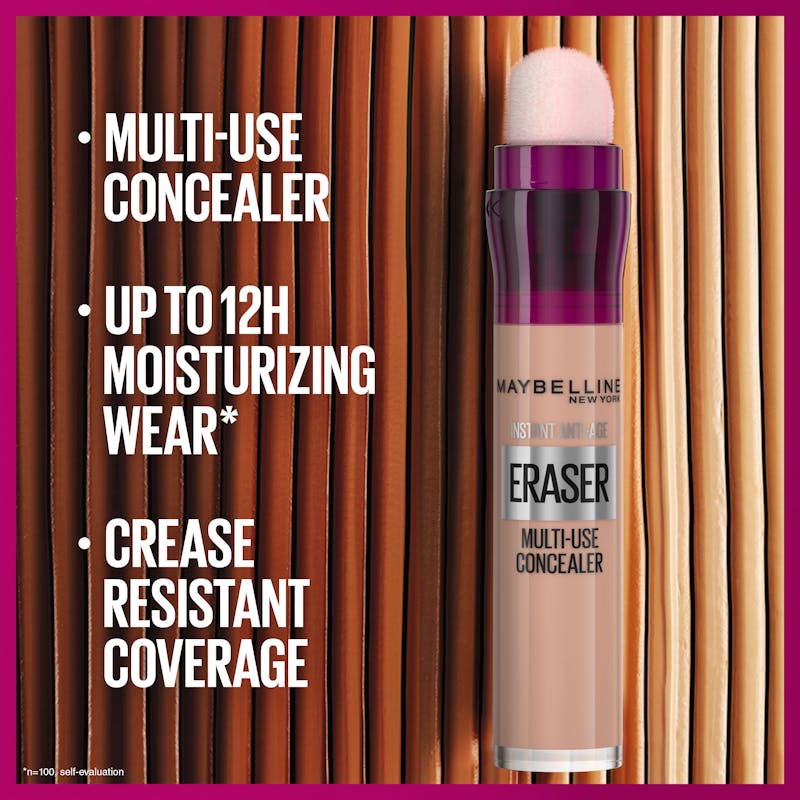 Prova en concealer som återfuktar och ger en stålande, naturlig look. Maybelline New York Instant Anti Age Eraser Concealer är en concealer för mörka ringar under ögonen samt märken på huden i en behaglig, flytande, vegansk formula* med medium täckningsgrad.