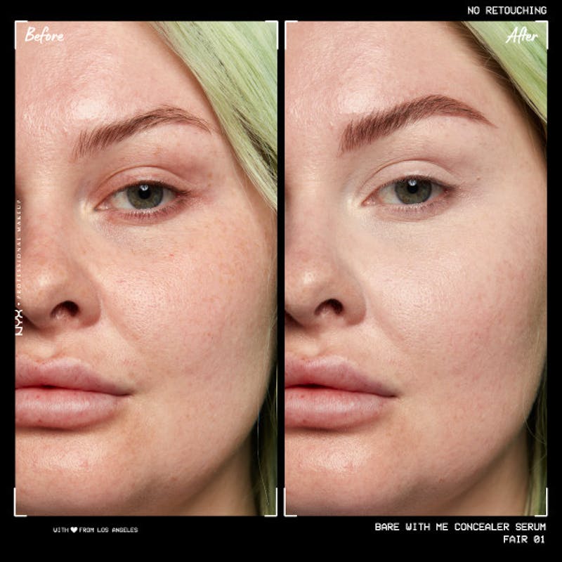 Stressad över din hy? Inte idag! Här kommer vårt vårdande concealerserum för ansikte och kropp: Bare With Me Concealer Serum från NYX Professional Makeup. Vegansk formula* och upp till 24 timmars fukt för en hud som känns återfuktad hela dagen. Berikad med tremellasvamp, cica och grönt te.  Detta är verkligen en skin-tervention! Mörka ringar, orenheter och ojämnheter? No more! Rodnad och torra områden? Inte nu längre! Dölj problemområden på din hud samtidigt som den får fukt. Blir inte kakig och känns lätt med en naturlig och i princip osynlig finish. Bare With Me CONCEALER Serum ger dig hudvårdsegenskaper i en pumpning. Enkel och jämn applicering med naturlig täckning. Tillgänglig i flera nyanser.