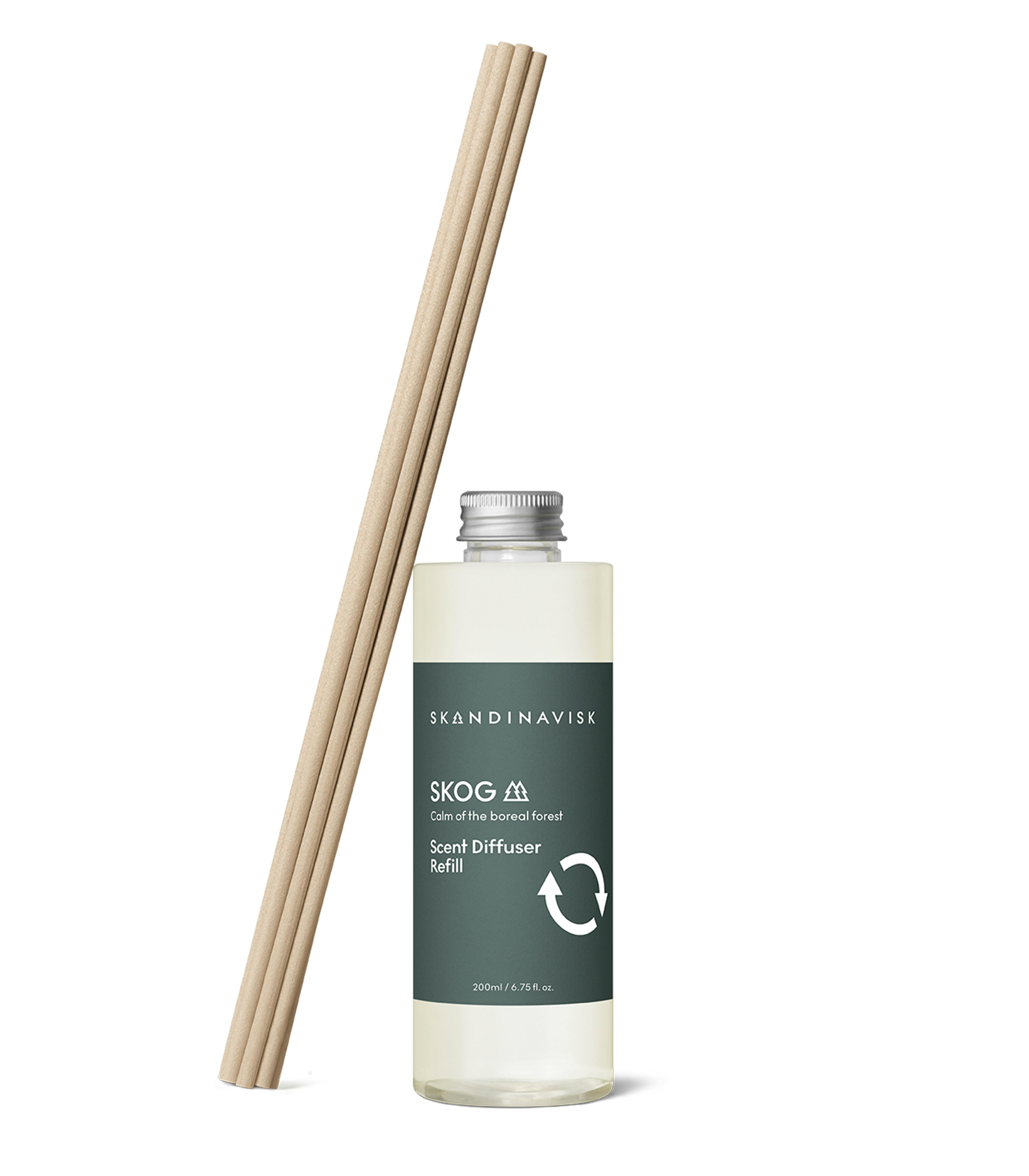 Den nya kollektionen av doftspridare från Skandinavisk blandar skandinaviska doftberättelser med förnybart odlade vegetabiliska oljor i en färgad glasflaska som är gjord för att kunna återanvändas med en refillflaska i ytterligare drygt 3 månader. Alkoholfri. Ofarlig. Vegansk. Refillflaskan på 200 ml är gjord av återvunnen plast (rPET). Häll bara innehållet försiktigt i den ursprungliga Skandinaviskflaskan, byt ut doftpinnarna, skölj och återvinn den tomma refillflaskan. Den FSC-certifierade förpackningen är tryckt med miljövänliga färger och kan även återvinnas.