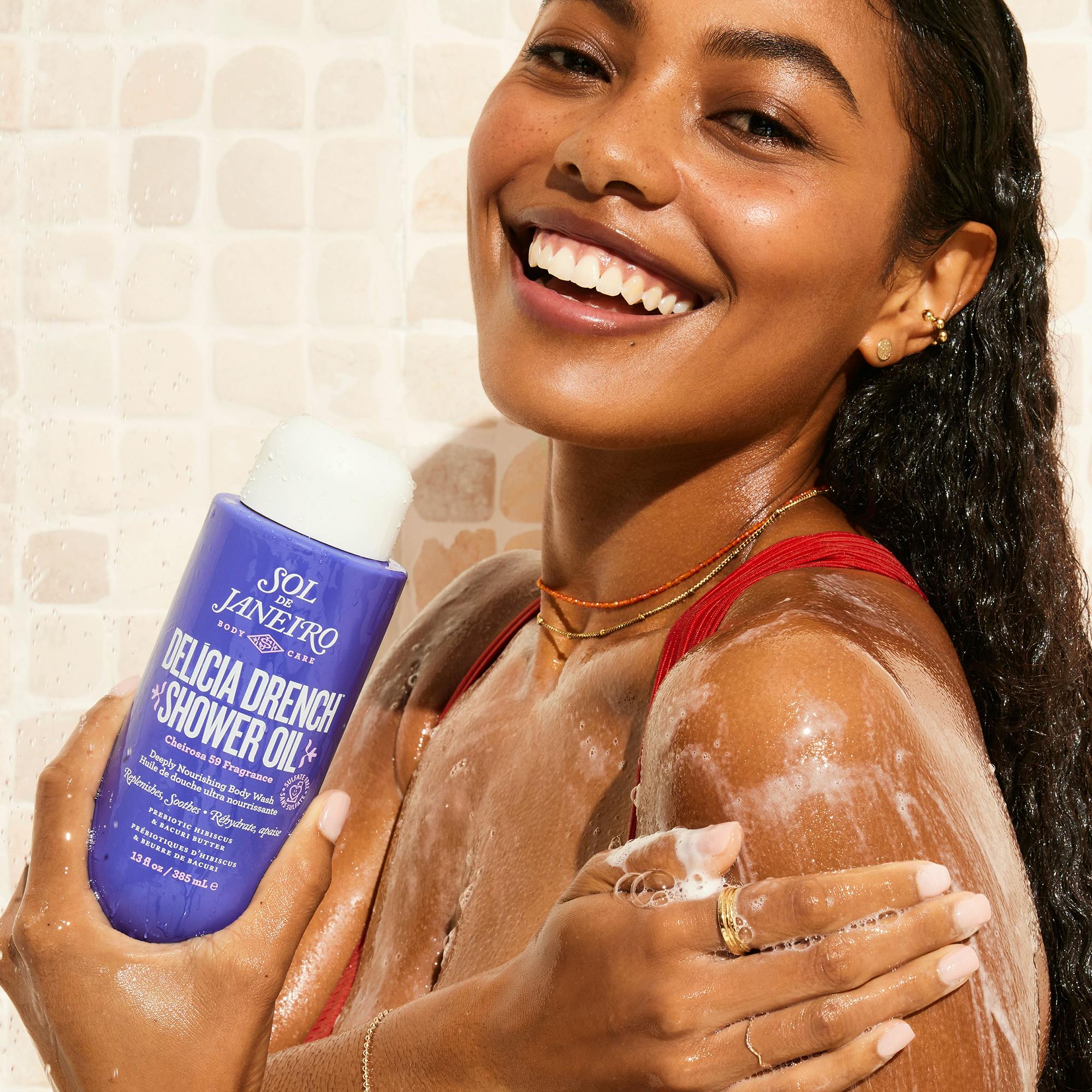 Delicia Drench Shower Oil från Sol de Janeiro är en djupt återfuktande duscholja som förvandlas till en mjölkig konsistens och är utformad för att stärka hudens barriär och stödja dess mikrobiom.
